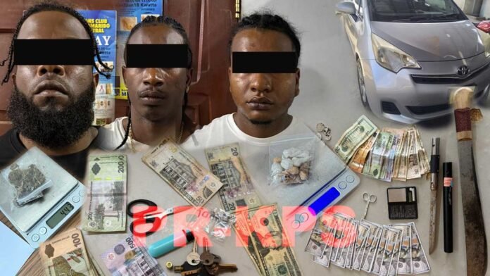 Bij hun arrestatie vond de politie verschillende scherpe voorwerpen, geld in SRD, vermoedelijk valse Amerikaanse dollars, een verschoten 9mm patroon en meerdere soorten drugs. Ook in het voertuig werd nog een scherp voorwerp aangetroffen. Alle goederen en wapens zijn in beslag genomen voor verder onderzoek.